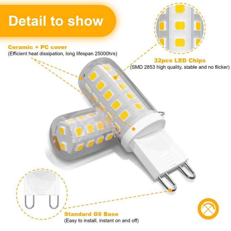 - [Einfache Installation]: Mit einer G9-Fassung ausgestattet, gew?hrleistet diese LED-Glhbirne eine einfache und schnelle Installation. Sie leuchtet sofort ohne Verz?gerung auf. Verwenden Sie sie nicht mit Dimmern, um Flimmern und Kurzschlsse zu vermeiden.