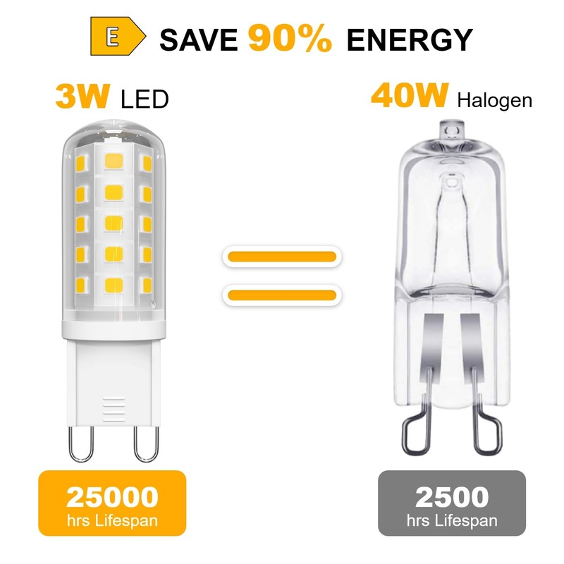 - [Energieeinsparung]: Diese G9 3W LED-Glhbirne dient als effektiver Ersatz fr 30 - 40W Halogenlampen und bietet bis zu 90% Energieeinsparung. Sie ist so konzipiert, dass sie einen geringen Verbrauch hat und gleichzeitig ausreichend Helligkeit bietet.