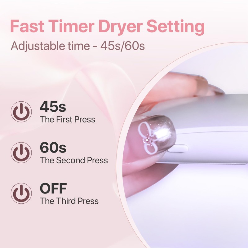 - 【Easy to Use】The UV Nail Lamp is designed with simplicity in mind, featuring a one-button operation and built-in timer for easy use. With just one touch, the lamp runs for 45 seconds; two touches for 60 seconds, and three touches to turn it off. This user-friendly design ensures consistent and efficient curing for your gel nails, acrylics, and resin crafts.
