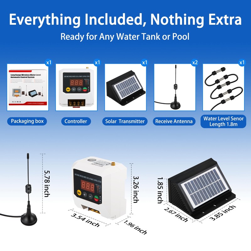 - The automatic water level control system is used to regulate the water level of storage containers such as swimming pools, water tanks, and water towers. Antenna line length 2.9m; Sensor wire length 1.8m.