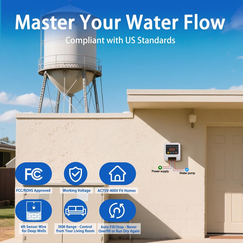 - It can help you: 1. Automatically start water filling to avoid discovering water shortage in the storage container when water is needed; 2. Automatically stop water filling to avoid wasting water resources due to forgetting to turn off the water pump; 3. To avoid damage to the water pump caused by prolonged working time of the water pump; 4. Remote wireless detection and display of water level in water storage containers;