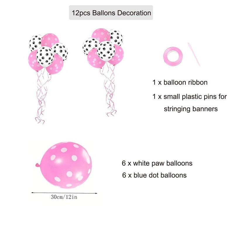 - Puppy Birthday Decorations Set: Dog birthday decorations package including 1 x happy birthday banner, 1 x bowtie, 1 x dog birthday bandana, 1 x dog party hats, 9 x numbers(0-8), 6 x white paw balloons, 6 x pink dot balloons, 1 balloon ribbon, 1 small plastic pins for stringing banners. Now let's dress up your pet for the birthday party.
