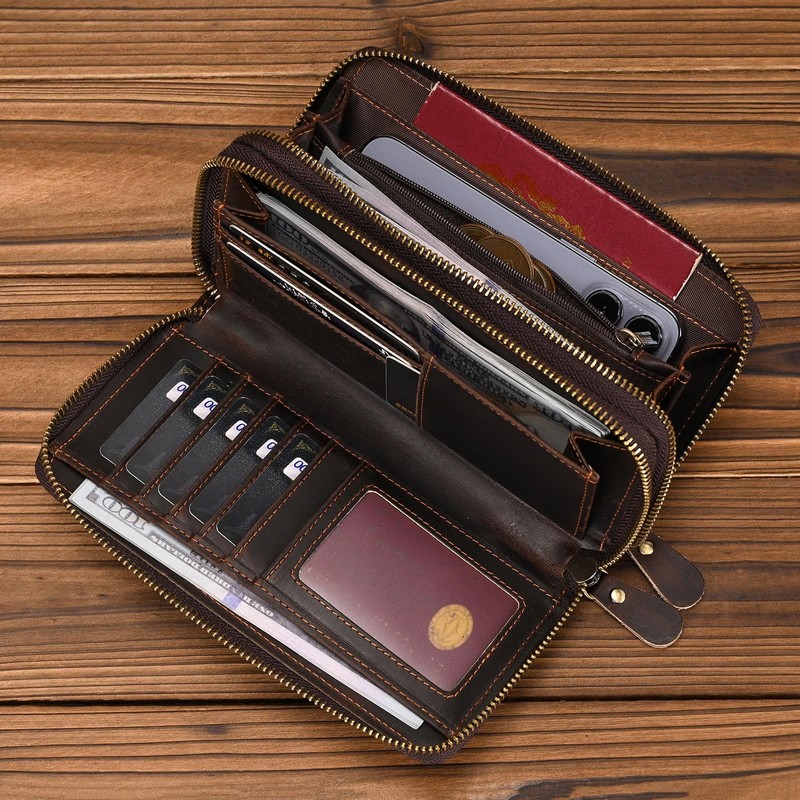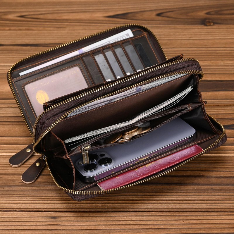 - Dual Zipper Large Capacity Design The double zipper wallet has two separate zippered compartments for maximum space to organize your essentials. 1 large compartment for smartphone (up to 5.5 inches), 2 money slots, 8 card slots, 1 zip pocket, 4 intermediate compartments. You can carry your passport, credit cards, cash, coins and notes safely and easily. The slim wallet can be easily stored in handbags, backpacks or other bags.