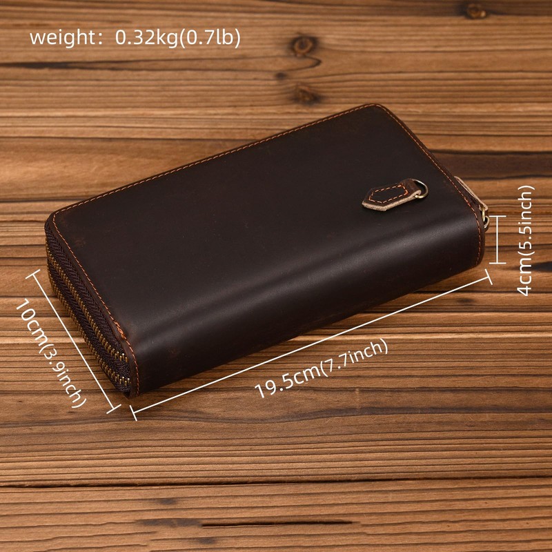 - GENUINE LEATHER The long leather wallet was made of high quality Crazy Horse leather. It is durable, comfortable and luxurious. Dimensions: L7.7*H3.9*W1.57inch(19.5*10*4cm), Weight:about 0.32kg(0.7lb).