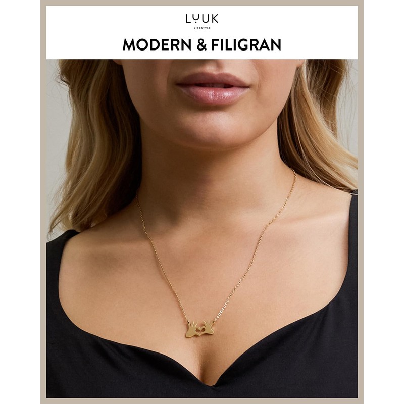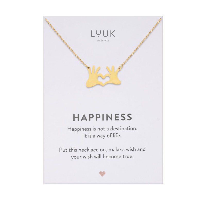 - Simple design – beautiful, filigree stainless steel necklace in timeless design with heart-shaped hands in gold including Happiness saying card. The necklace looks feminine, stylish and can be combined in many ways.
