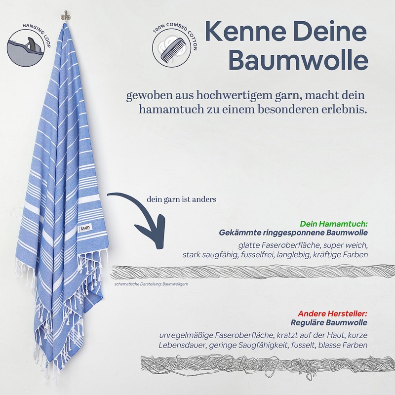 - [My promise] - My inventors have given a lot of effort with me. When they noticed that many hammam towels contain polyester but are still sold as 100% cotton and microfibre towels are no longer contemporary, they wanted to create something special. I am now and I have come to stay. Hello, my name is Luum and I am 100% cotton.