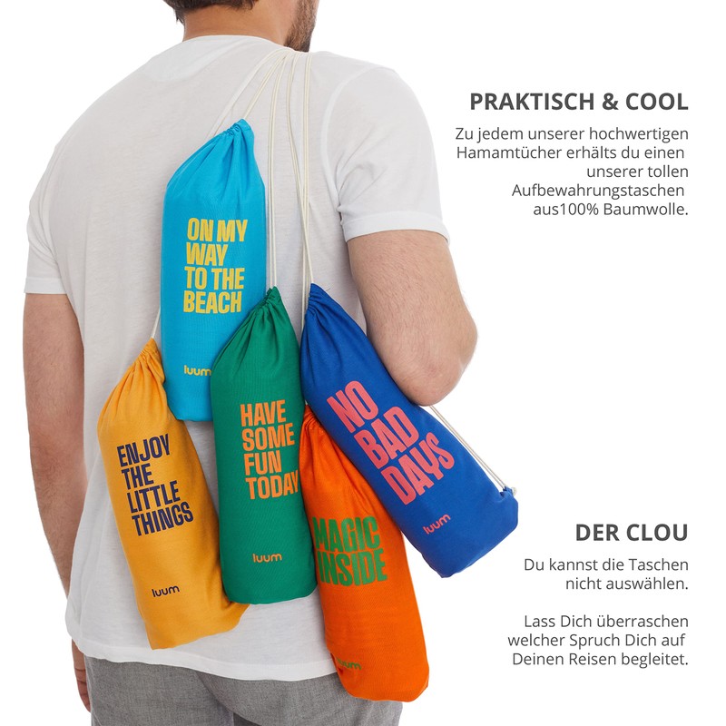 - Sand-free, practical and cool: As a beach towel, I really have something on it. Sand I keep off your neck. I come in a super cool and breathable storage bag. Carry me over the shoulder, like a shoulder bag or like a backpack. The highlight: you can't choose my bag. Let yourself be surprised which saying accompanies you on your travels.