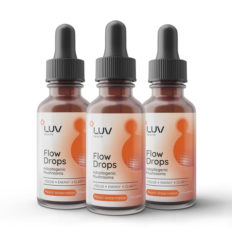 Unlock the power of nature with LUV health Flow Drops, your daily support for enhanced mental clarity, energy, and focus.Each drop is infused with a potent blend of adaptogenic mushrooms, including Lion's Mane for cognitive support, Cordyceps for natural energy, and Reishi for immune health. Perfectly balanced for a modern lifestyle, our Flow Drops are designed to support your mental and physical well-being, helping you navigate through your day with ease. These drops are a convenient, liquid alternative to support your wellness goals, vegan and keto-friendly, to seamlessly fit into any dietary preference. Vegan, KETO, soy-free, and gluten-free, these gummies are crafted for comprehensive support. Enjoy the ease of adding these to your daily routine, made with care in the USA and 3rd party tested for quality you can trust.