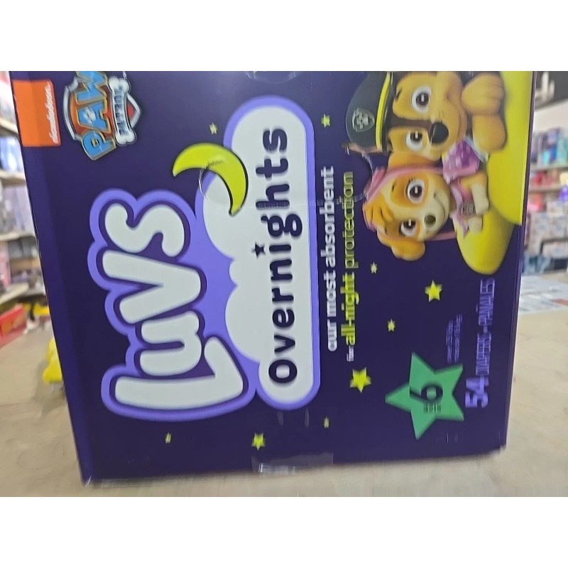 The product is Luvs Diapers Overnight Size 6, designed for babies. This particular box contains 54 purple-colored diapers, making it a convenient choice for parents looking for overnight protection for their little ones. Luvs is the brand known for providing quality disposable diapers, and this specific product is tailored to offer extended absorbency and leakage protection during nighttime use. Perfect for babies in size 6, these diapers ensure a comfortable and dry experience for your child throughout the night.