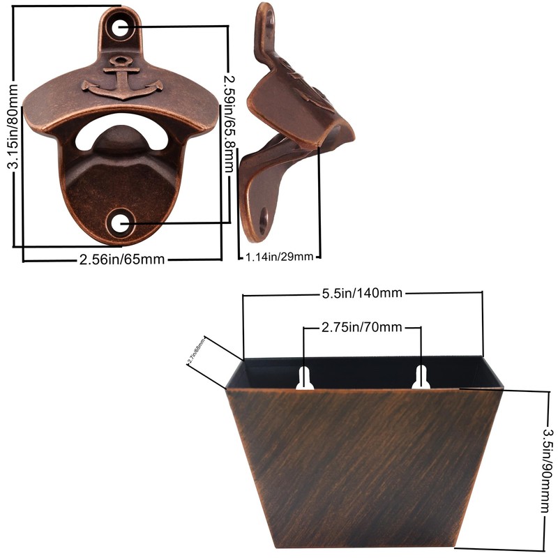 - Material and finish: The mountable beer cap opener is made of stainless metal, rustproof, vintage rustic look of the copper bottle opener; the cooler mounted beer bottle top holder is made of stainless steel and with two tone hand painted finish, excellent to use indoor and outdoor