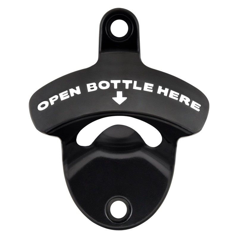 - Material and finish: The wooden board mounted beer bottle cap opener black with white debossed "OPEN BOTTLE HERE" is made of stainless metal, rustproof