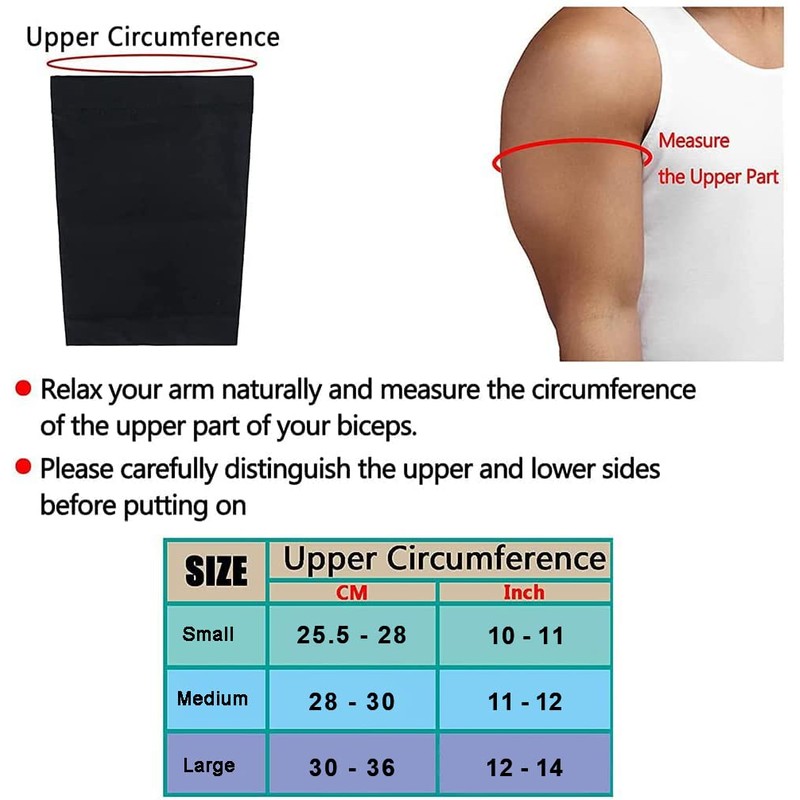 - Light and thin material. Unisex. Size M fits for upper circumference 10 - 11 inch; Size L for upper circumference 11 - 12 inches; Size XL for upper circumference 12 - 14 inches. We highly suggest you to measure refer to size chart to pick the arm sleeves