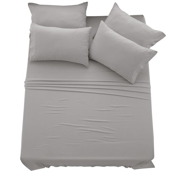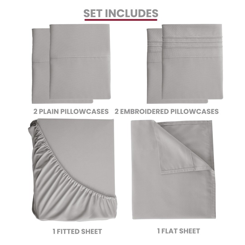 - 6 PIECE SHEET SET : Queen sheet set includes 1 flat sheet (90x102 + 4 inches), 1 fitted sheet (60x80), and 4 pillowcases (20 x 30 + 4 inches, 2 embroidered and 2 plain). Available in multiple colors to match your room's décor