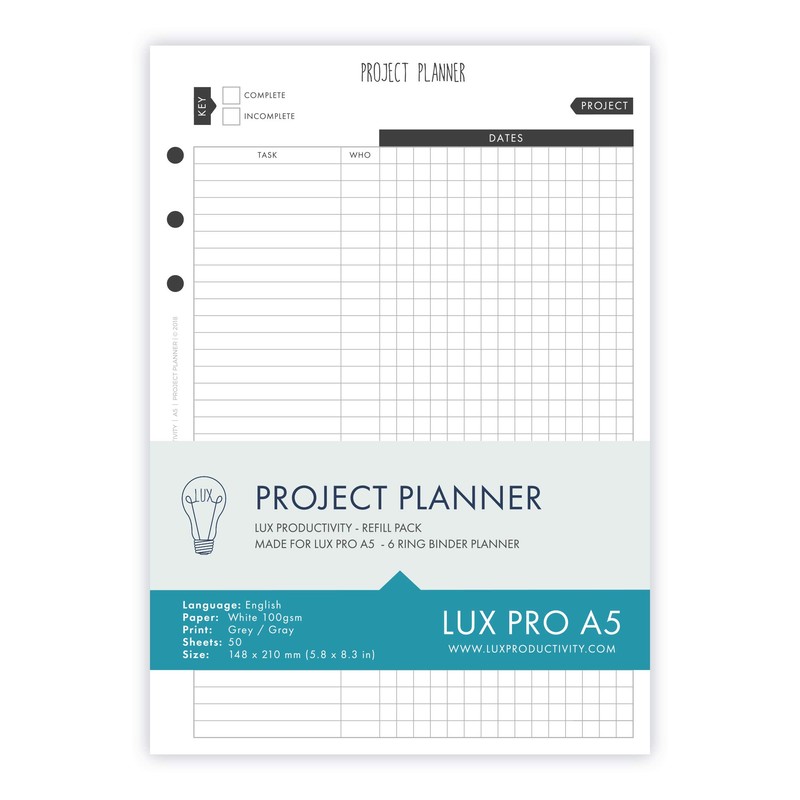 LUX PRO A5:Project Planner - LUX Productivity Refill Pack - Planner Page Inserts - Compatible with The LUX PRO A5 6-Ring Binder Organizer