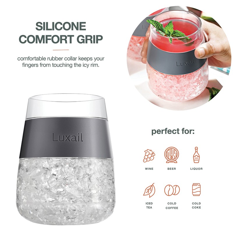 - INSULATED WALLS filled with proprietary cooling gel work as a wine chiller when frozen. Pop a plastic insulated wine glass in the freezer for white wines or cool in the fridge to keep red wines at cellar temp