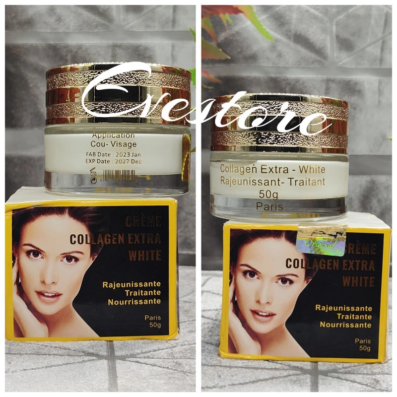 Authentic products New collagen Extra white is formulated to treat, rejuvenates and nourishes your facial skin.ย . Enriched with fruit extracts, vitamins, collagen and vit. E.