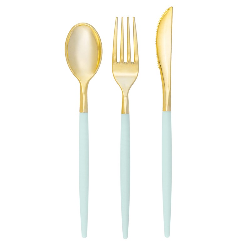 Luxe Party 128 Pieces Two Tone Plastic Disposable Cutlery | Forks-Spoons-Knives | Full Size | Chic Round | Mint and Gold