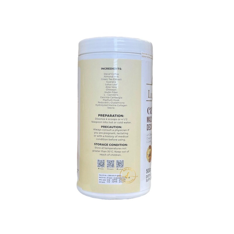 Introducing Luxe Slim Caffe Macchiato Decaf 500g, a decaffeinated coffee that brings a delightful twist to your daily routine. This premium blend is formulated with powerful ingredients like Collagen, Glutathione, and L-Carnitine to provide numerous benefits.