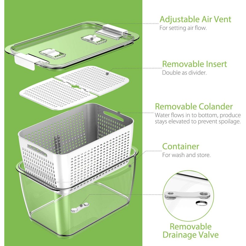 - đ ăFresh Fridge ContainersăLUXEAR fruit container sets come with 18 cup, 6.8 cup and 1.92 cup three of containers. Each of storage containers designed with adjustable vents which can regulate the flow of air in and out, control the humidity inside, help prevent spoilage, keep fruits and vegetables fresh for up to two weeks for maximum freshness. The lid is airtight, please make sure you close the lid well.