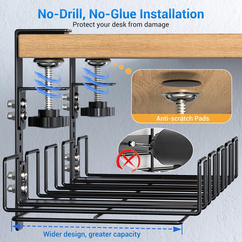- 【No Drills, No Scratching, Easy to Install:】Our Luxear under-desk cable management organizer basket /tray /box requires no drilling! This cable tray comes with a clamp-so you won't damage your table with screws and drills, The screw clamps on either side sports soft rubber pads, for a secure mount. Also, you can change its position-moving it inward or outward of your desk, as required.