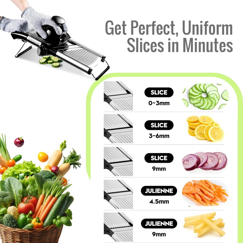 - [Adjustable Settings:] Adjust the thickness settings to get your desired cut, from paper-thin slices to thick julienne strips up to 1/2 inch.