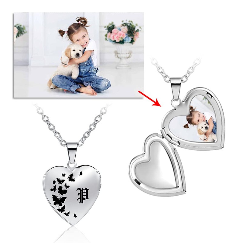LuxglitterLin Butterfly Photo Locket Necklace that Holds Pictures Old English Font Initial P Alphabet Letter Heart Shaped Memory Locket Pendant