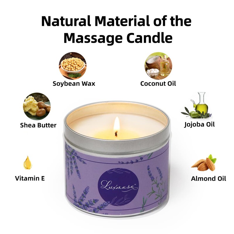 - SAFE MATERIAL---LUXMASA Massage Oil Candle is made from all Natural Friendly soybean lecithin infused with Shea Butter, Coconut Oil, Jojoba Oil and Vitamin E.The 100% Cotton wicks are lead-free. No Paraffin wax. No Mineral oil. Clean Burning.