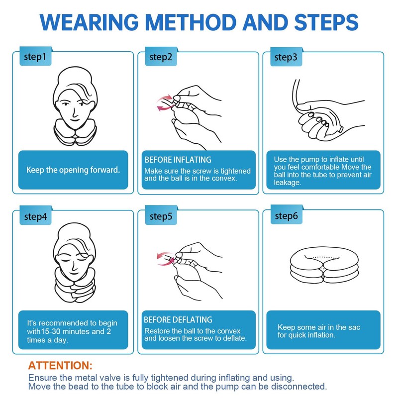 - ๐๐๐ฌ๐ฒ ๐ญ๐จ ๐๐๐ซ๐ซ๐ฒ ๐๐ง๐ ๐๐ซ๐๐ฏ๐๐ง๐ญ ๐๐ข๐ซ ๐๐๐๐ค๐๐ ๐๏ผOur posture pump cervical neck traction features a convenient inflatable design. Cervical traction with a simple inflation mechanism and anti-leakage devices, you can quickly inflate it to your desired firmness level and avoiding air leakage. When not in use, deflate it easily to a compact size, making it effortless to store in your bag or luggage, perfect for any adventure, fishing, campingor daily commute. Neck restalso wears an eye mask for added sleep comfort.