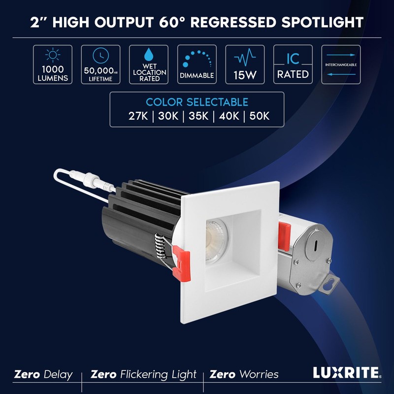 LUXRITE 2 Inch Square LED Recessed Lighting with Junction Box, 15W, 5 Color Selectable 2700K-5000K, CRI 90, 1000 Lumens, 60° Spotlight, Small Dimmable Downlight, Wet Rated, IC Rated