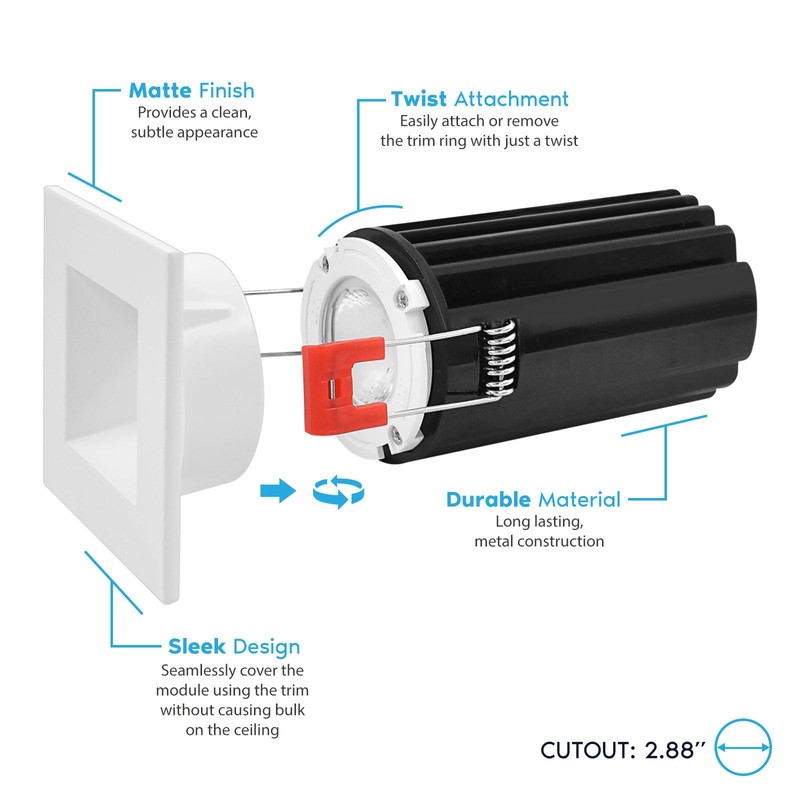 • EASY INSTALL - Get these recessed spot lights set up in just a few simple steps since everything you need is in one complete kit! Cut a 2.83" hole into your desired location, fit the interchangeable trim to the fixture with it's twist lock feature, connect the wiring in the included junction box, then fit the fixture into the space with the spring loaded clips for a flush to ceiling finish.