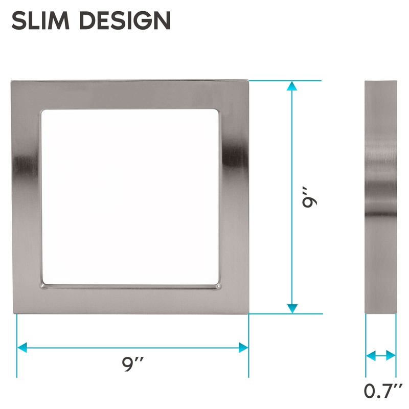 - Easy Install - No hassle Installation with a flush mount LED ceiling light which can be set up in a few easy steps! Just follow the Installation guide to apply the brushed nickel trim cover onto the fixture, connect the wiring on the back of the low profile ceiling light and screw the square light fixture in using the supplied screws and you are all done! Each 9 inch LED light is 0.7 inches thick making this a Slim option for your ceiling Lighting.