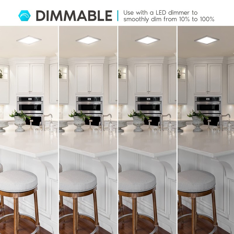 - Dimmable - Adjust your Lighting at any time with a square ceiling light that let's you easily control the Brightness with it's Smooth Dimming feature that can be reduced from 100% to 10% Lighting output. Dim down to your preferred setting without flickering or issues. With a damp location rating, these flush mount LED lights can be used in the shower, bathroom, kitchen, living room, entryway, bedroom, closet, or any indoor and outdoor location you choose.
