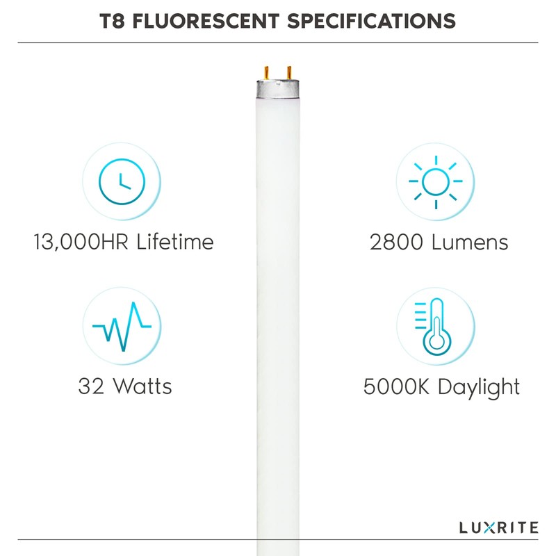 LUXRITE F32T8/850 32W 48 Inch T8 Fluorescent Tube Light Bulb, 5000K Bright White, 2800 Lumens, G13 Medium Bi-Pin Base, LR20734, 12-Pack