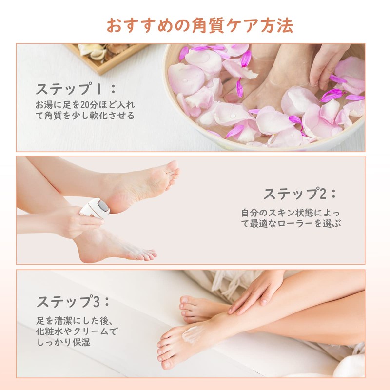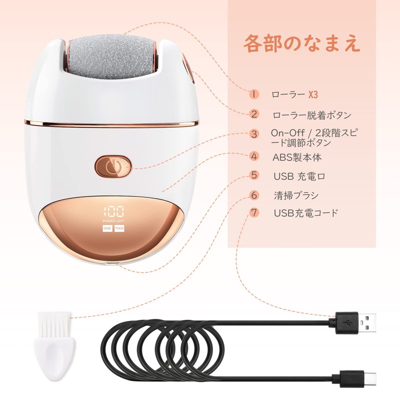 - 「3種類ローラー」 電動式の角質リムーバーは細目ローラー、レギュラーローラー、粗目ローラーという3種類のローラーが付属され、自分の足裏の状態に適応なローラーを取付、頑固な角質も、日常的なお手入れもこの1台で実現できます