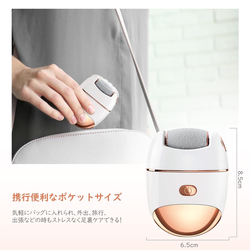 - 「高速モーター&2段階強度」 強力モーターを採用し、低速2025回転&高速2200回転の2つの強度モートが設計されており、ケアする部位によってスピードを選び、スイッチを入れるとローラー部分が高速回転、かかとや足裏に沿って滑らせていくだけで、簡単&手早く角質がポロポロ剥がれていきます。肌にやさしいながら、つるすべな足を仕上げてくれます。