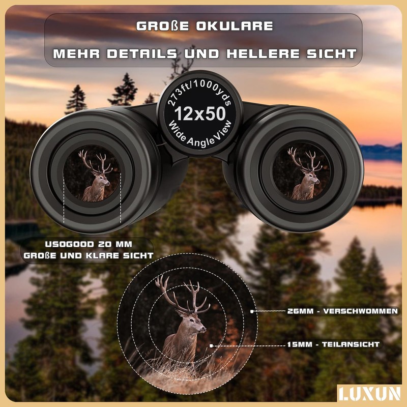 - ☀12x50 binoculars ☀ 20 mm large eyepieces with 12x HD magnification can provide details of the observed object at 273 ft/1000 yds. LUXUN 12 x 50 binoculars combine the advantages of image clarity and compact size. The 50 mm aperture objective lenses present a brighter and clearer field of view, so you feel as if you are in the world as you are watching it.