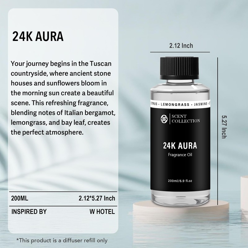 Luxury Hotel Scent 24K Aura Diffuser Oil Waterless Essential Aromatherapy for Cold Air & Car Diffusers – Long Lasting Refill for Large Room & Home - Non Toxic, Signature Lemongrass (200ml/6.76Fl oz)