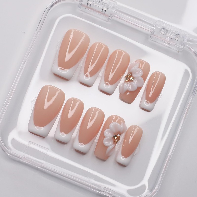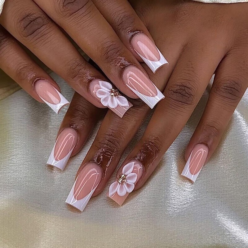 Luxury Press on Nails Medium Square Handmade 3D Unique Reusable ABS Material Fake Nails White French Tip False Nails with Designs Floral Rhinestones Elegant Glossy Glue on Nail Thick Acrylic Nail(S)