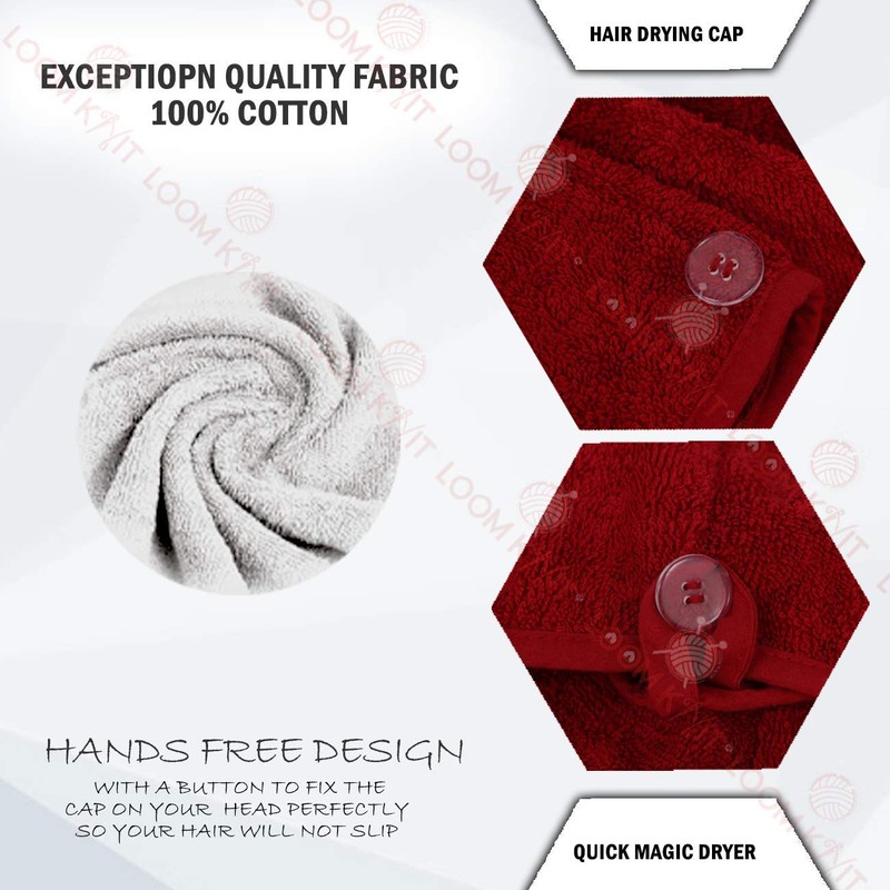 - ✔High Quality & Easy-care: Made from high quality 100% cotton fabric, not microfibre our Hair Drying Towel Cap is highly durable machine washable at 30 degrees. Available in multiple colors to choose from for perfect style and look. The hair drying cap is secured to your head by a loop and button fastener, This hand free design allows you to do your other important work instead of spending time drying your hair.