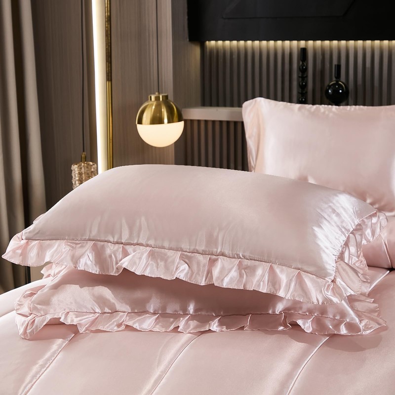 - KING COMFORTER SET with SHEET SET - 1 light pink satin ruffle comforter(104''*90'') + 2 light pink satin ruffle pillowcases(20''*36'') + 2 light pink satin pillowcases(20''*36'') + 1 light pink satin flat sheet(110''x 104'') + 1 light pink satin fitted sheet(78''x 80'' + 12'') + 1 light pink satin ruffle cushion cover(18''x18'')
