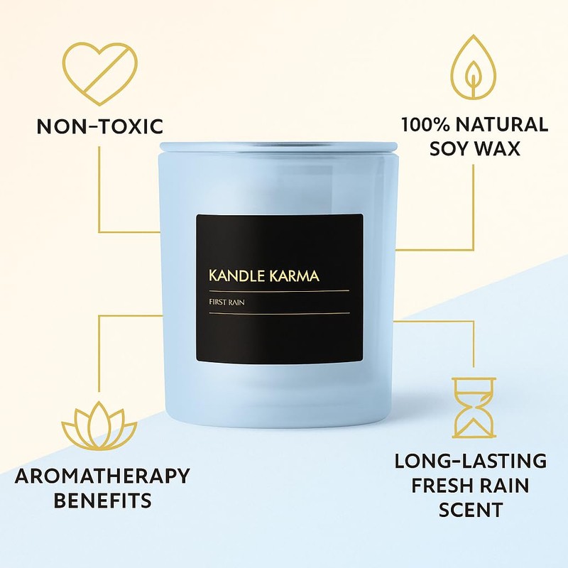 - KANDLE KARMA SOY WAX CANDLE: Transform your home into a calming retreat with the Kandle Karma First Rain Candle. Made with premium soy wax and weighing 200g (7oz), this large candle releases a clean, herbal scent that refreshes the air and brings a serene, spa-like feel to any room.