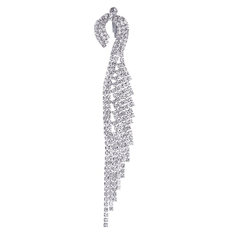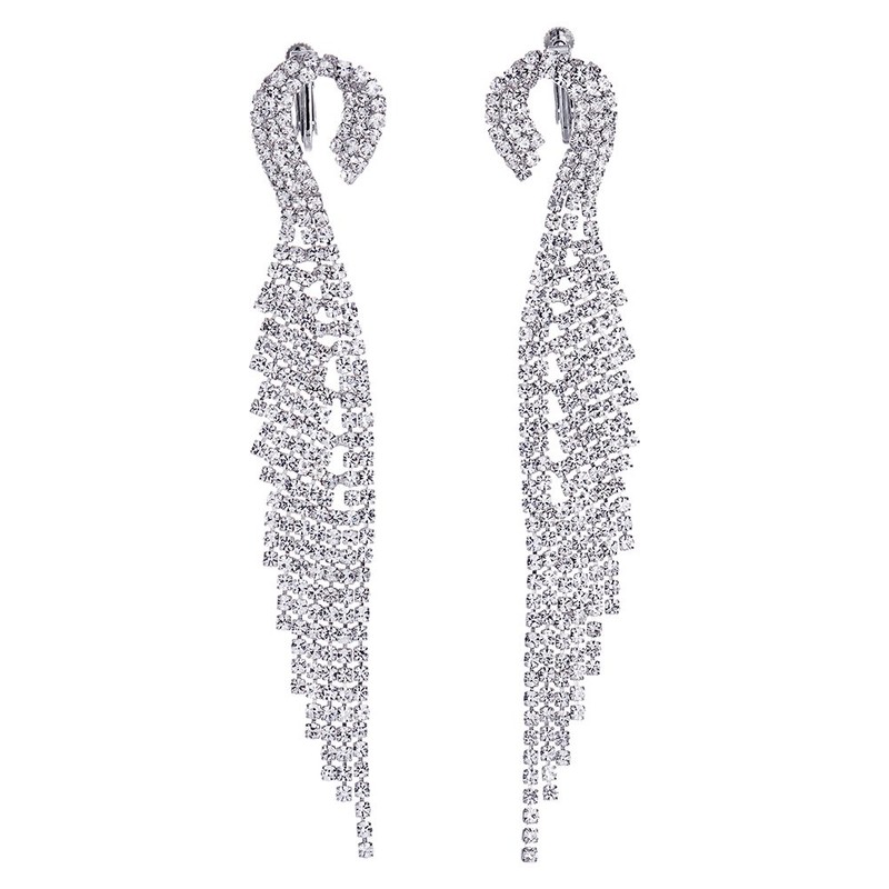 Luxury Wedding Bridal Bridesmaids Party Rhinestone Angle Wing Feather Long Dangle Clip-on Earrings