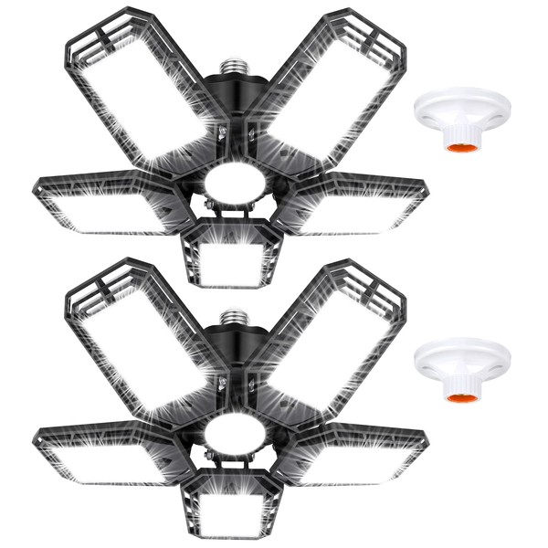 - ☀️【30s Fast Install】Our Deformable LED ceiling light for garage uses E26/E27 base same as the LED bulb. No tools or wiring required, just need to align the E26 screw and rotate it right. Wide application fit for garage, patio, basement, warehouses, workshop, exhibition hall, sports hall, mining, supermarkets, parking lot, gym, barn, workbench, bay, laundry room, closet, etc.