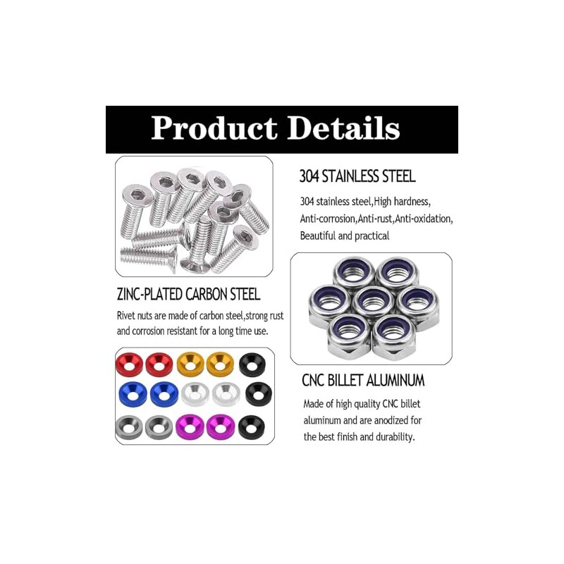 - 3.APPLICABLE OCCASIONS:These aluminum washers and fender bolts can be used for fenders, bumpers, headlights, trunks and some items that need to be fixed in daily life.