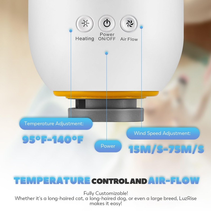 - 95-140°F TEMPERATURE & 15-75M/S AIRFLOW - The dog hairdryer is equipped with a 2800W pure copper motor, providing a high wind speed of up to 75 m/s, allowing for quick drying of your pet's fur from the roots. Whether it's a long-haired cat, a long-haired dog, or even a large breed, LuzRise can easily handle it. With 95°F-140°F adjustable temperature control and 15m/s-75m/s 5-speed wind adjustment, you can flexibly adjust according to the environmental temperature and the thickness of your pet's