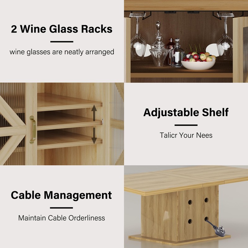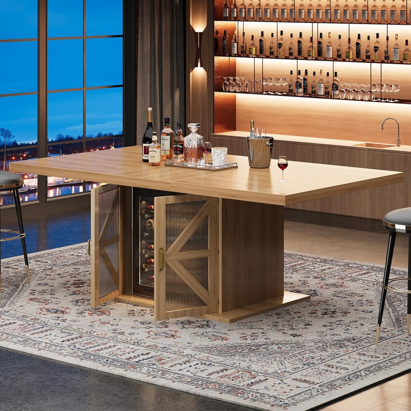 The spacious cabinet (22.44" × 14.57" × 27.6") doubles as a multi-purpose storage area. By removing the shelf, you can fit a compact mini fridge inside (fridge not included). Two built-in wine glass racks add both convenience and a stylish touch to this storage dining table.