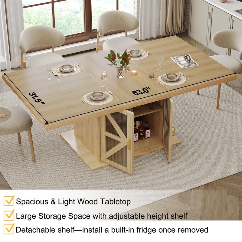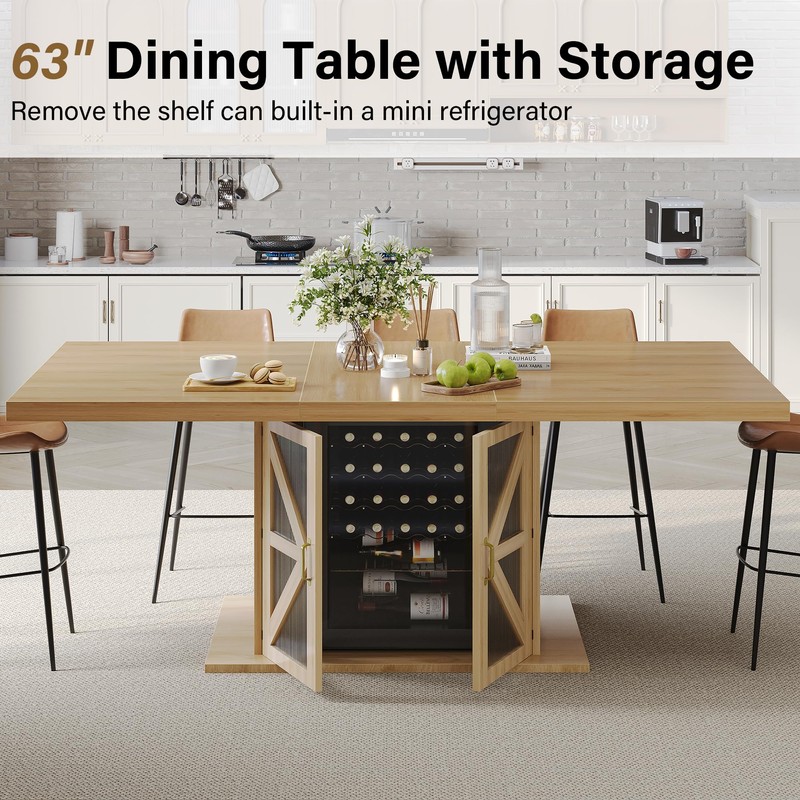 - Stylish and Light Wood Dining Table :This 63" rectangular dining table with storage combines natural charm with practicality. Featuring a warm light oak finish, it’s easy to maintain and works well in kitchen, dining room, or apartment spaces. Its farmhouse-inspired design fits rustic or minimalist interiors perfectly.