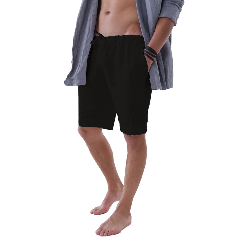 LVCBL Men's Casual Linen Shorts Drawstring Summer Beach Shorts Black L