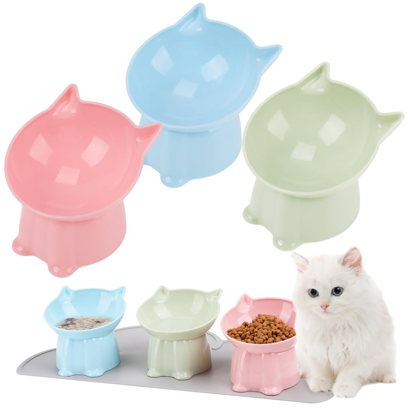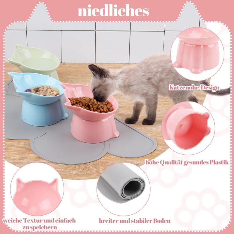 Lvefyti 3 Stück Futternapf Katze, Katzennapf Erhöht Katzen Napfset Kunststoff mit 15°Neigung Design und Unterlage Anti Erbrechen Futternapf Katzen Futter und Wasser Fütterung Schüssel
