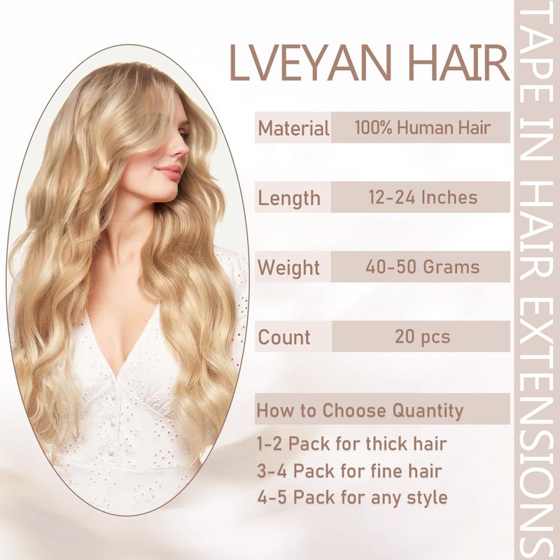- 【20pcs Tape in Hair Packaging and Specifications】: Lveyan tape hair extensions, 20 pieces, 12inch-14inch : 40g/pack , 16inch-24inch : 50g/pack, each pack come with replacement tape . there are many colors to choose from, According to your own hair volume, usually 2-3 packs can fill your full head, increasing length and volume. If you have Thin hair, we recommend purchasing more than 3-5 packs to achieve a perfect result.